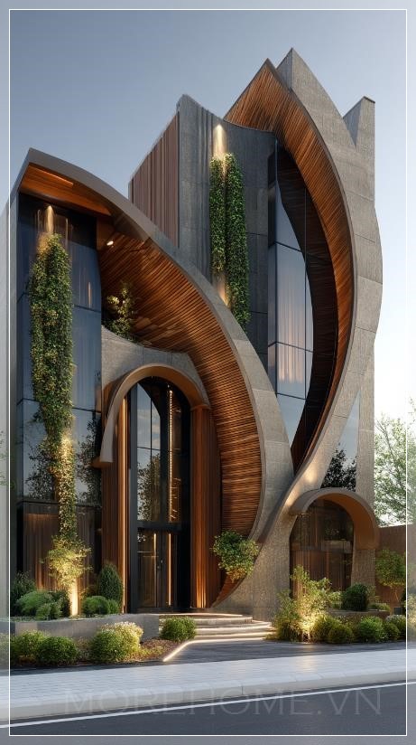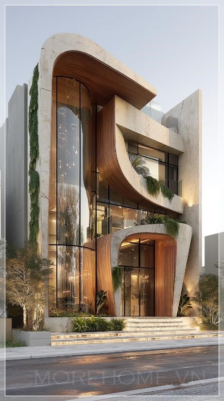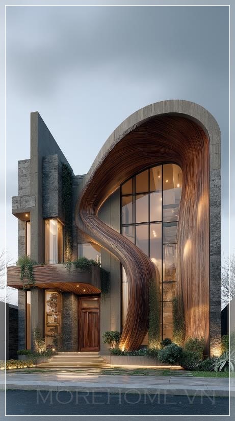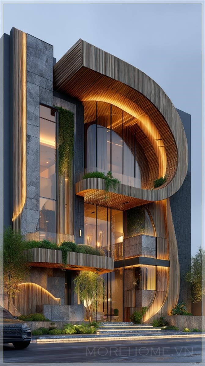 Mặt tiền của ngôi biệt thự này thu hút ánh nhìn ngay từ cái nhìn đầu tiên với những đường cong động lực học độc đáo. Không còn là những đường thẳng cứng nhắc truyền thống, kiến trúc sư đã khéo léo tạo ra những làn sóng kiến trúc chảy từ tầng này sang tầng khác, như thể ngôi nhà đang nhảy múa theo nhịp điệu của gió và ánh sáng. Mỗi đường cong được tính toán tỉ mỉ, vừa đảm bảo tính thẩm mỹ vừa tối ưu hóa chức năng sống.